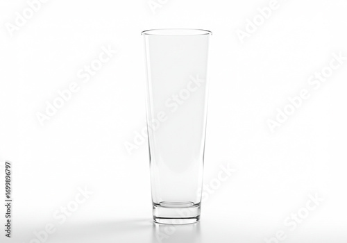 Empty clear glass tall slender vase or drinking glass on a white background.