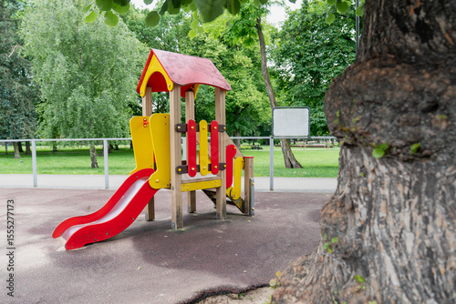 empty colorful children's playground slide structure in public park with trees and green grass, red and yellow plastic slide for outdoor fun and playtime in peaceful natural recreational area