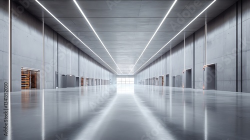 hallway, empty, concrete, receding, door, polished, floor, light, illuminated, building, structure, interior, indoor, perspective, vanishing point, large, roomy, long, bright, modern, minimalist, architecture, design, grey, clean, storage, horizontal, parallel, commercial, industrial, space, passage, direction, pathway, corridor, way, leading