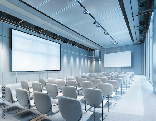 conference room, meeting room, presentation, auditorium, screen, projector, chair, seminar, training, conference, lecture, meeting, business, professional, office, corporate, modern, interior design, architecture, interior, contemporary, clean, minimalist, light, bright, roomy, empty, blank, template, design, white, grey, blue, steel, glasses, large, wide, floor, carpet, ceiling, light