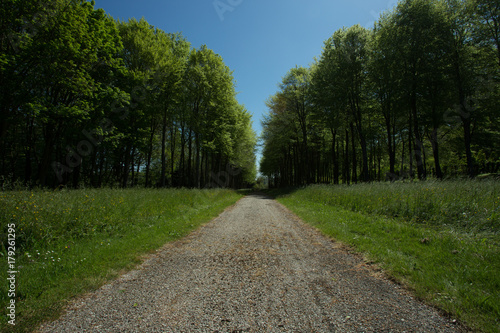 Empty country gravel road passing through the forest in the region of Normandy, France. Nature and holidays. Transportation and road network concept. Countryside landscape in summer sunny day. Toned.