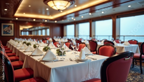 Empty dining table on cruise ship set for a meal showcasing elegance and dining experience at sea