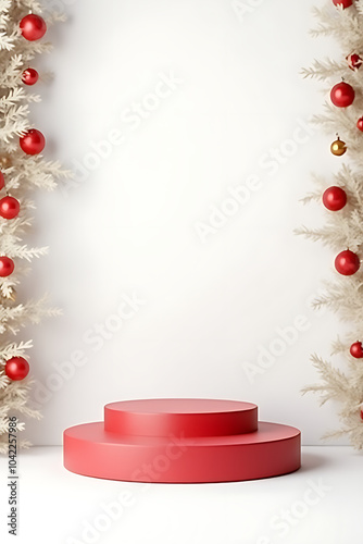 empty, festive, dais, stand, red, gold, accent, white, christmas, background, rendered, scene