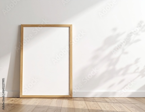 frame, empty, wall, white, plant, shadow, wood, wooden, floor, interior, design, art, gallery, poster, picture, contemporary, minimalist, home, decor, style, template, presentation, blank, portrait, vertical, natural, light, bright, room, space, simple, modern, elegant, realistic, three-dimensional, rendering, visualisation, background, copy space, advertising, marketing, branding, display, showroom, office, home office
