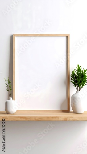 frame, shelf, wooden, white, empty, plant, vase, decor, home, interior, design, minimalist, modern, natural, simple, neutral, light, empty space, still life, poster, art, room, background, texture, lighting, three-dimensional