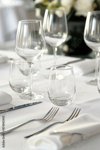 eatery, table, setting, empty, glasses, goggles, silverware, white, linen, tablecloth, napkin, cutlery, fork, knife, elegant, fine, dining, luxury, meal, dinner, lunch, service, catering, event, celebration, party, indoor, no, people, bright, clean, shiny, sharpened, foreground
