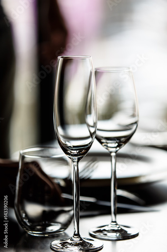 Empty glasses for champagne and wine are on the table in a row.