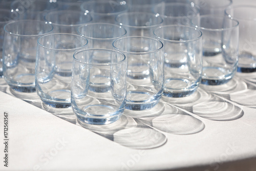 goggles, empty, table, sunlight, shadow, clear, drinking, white, tablecloth, row, ready, waiting, bright, light, glasses, refreshment, beverage, drink, party, event, catering, preparation, service, outdoors, summer, clean, transparent, simple, minimalism, pattern, texture