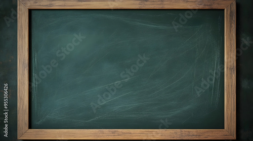Empty green chalkboard background with wooden frame. Dirty erased chalk texture on blank blackboard with copyspace and wood border. Restaurant menu or back to school education concept. 3D rendering.