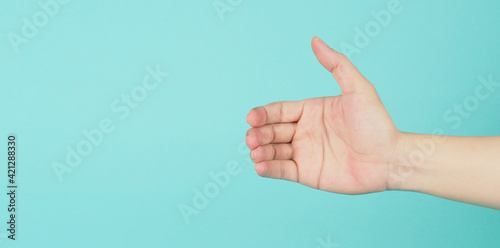Empty Hand holding or catch nothing guesture on green and blue or mint background.