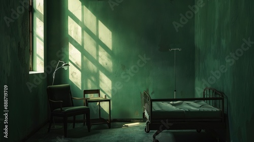 hospital, room, bed, green, wall, window, chair, light, shadow, empty, abandoned, medicals, care, health care, treatment, interior, design, vintage, old, retro, furniture, table, floor, sunlight, dark, gloomy, solitude, stillness, quiet, silence, space, atmosphere, mood, feeling, desolate, lonely