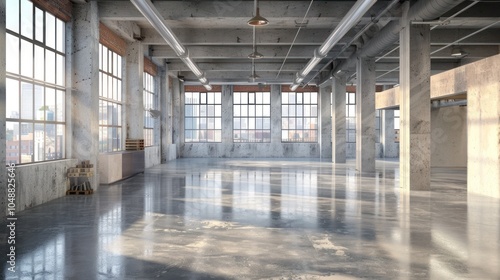 empty, loft, industrial, space, window, large, concrete, pillar, ceiling, beam, pipe, metal, exposed, brick, wall, floor, polished, grey, light, sunlight, shadow, city, view, urban, modern, minimal, clean, sterile, open, airy, roomy, bright, daylight, glossy, smooth, texture, rough, pattern