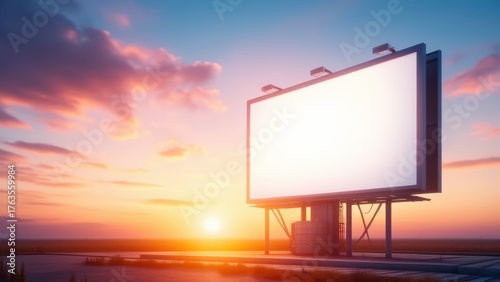 empty large format marketing billboard standing outdoors against a colorful sunset evening sky with warm light and clear gradient clouds, modern advertising mockup template concept of marketing