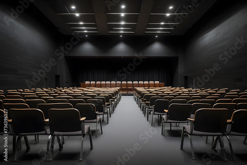 Empty lecture hall with dark walls background and chairs design.