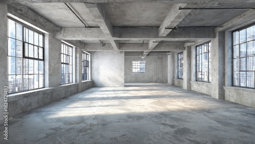 Empty loft space with large windows