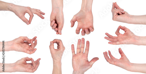 Empty male hand making gesture like holding something isolated on white background. Set of multiple images