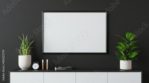 Empty mockup frame on a sleek cabinet, set against a dark wall in a chic living room, ready to showcase your artwork, elegant decor elements enhance the setting