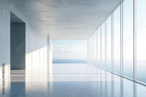 empty, modern, concrete, interior, ocean, view, roomy, bright, daylight, sunlight, minimalist, architecture, design, wall, floor, window, large, open, contemporary, room, hall, corridor, light, grey, white, blue, sky, cloud, sea, horizon, empty space, clean, geometric, minimal, office, commercial, huge, perspective