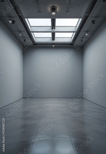gallery, modern, empty, space, ceiling, light, room, floor, wall, grey, grey, concrete, tile, design, architecture, interior, minimalist, simple, clean, bright, dark, roomy, huge, perspective, view, art, museum, exhibition, display, showcase, background, setting, environment, ambience, atmosphere, texture, reflective, polished, smooth, line, geometric, pattern