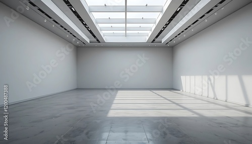 gallery, modern, empty, space, ceiling, light, floor, wall, white, grey, room, interior, architecture, design, building, structure, sunlight, shadow, minimalist, clean, bright, roomy, contemporary, art, museum, exhibition, display, background, perspective, line, geometric, simple, elegant, aesthetic, atmosphere, ambience, tranquil, serene