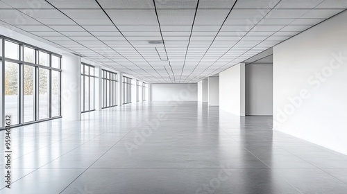 empty, office, corridor, modern, window, large, glasses, tiled, floor, wall, white, ceiling, grid, light, clean, space, minimal, design, architecture, interior, building, perspective, hallway, room, bright, open, roomy, professional, corporate, business, sterile, neutral, contemporary