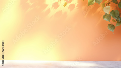 Empty orange light background, wall with soft shadow from leaves