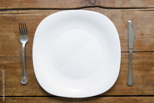 empty, plate, fork, knife, vintage, wooden, table, top, dish, wood, plank, red, detail, food, background, kitchen, utensil, white, square, ceramic, porcelain, diet
