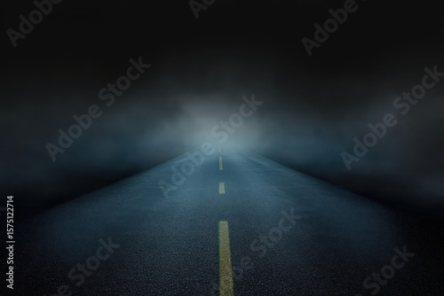 Empty road disappearing into thick fog at night creating an eerie and mysterious atmosphere