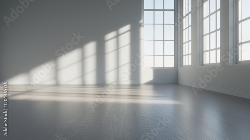 Empty room with large windows on the right side. the room has a white wall and a wooden floor. the windows are large and let in natural light, casting long shadows on the floor.
