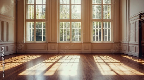 Empty room with sunlight streaming through large windows, warm natural light casting soft shadows across smooth, neutral-toned walls and a clean wooden floor.