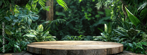 Empty round wooden platform surrounded by tropical leaves displaying products