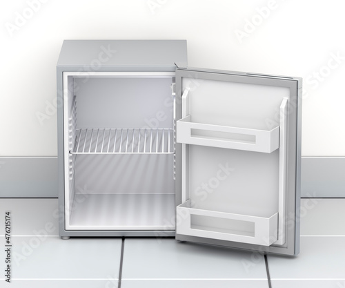 refrigerator, mini, refrigerator, small, appliance, electric, equipment, deep freezer, cooler, cold, kitchen, three-dimensional, open, empty, shelf, silver, front