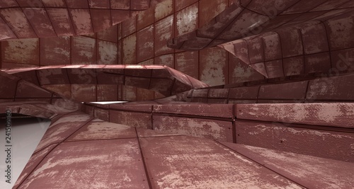 Empty smooth abstract room interior of sheets rusted metal . Architectural background. 3D illustration and rendering