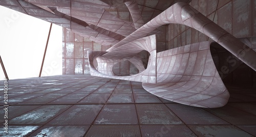 Empty smooth abstract room interior of sheets rusted metal. Architectural background. 3D illustration and rendering
