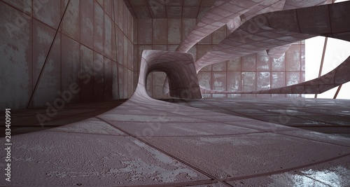 Empty smooth abstract room interior of sheets rusted metal. Architectural background. 3D illustration and rendering