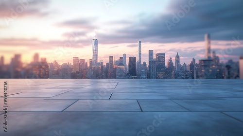 Empty square floor and city skyline with building background : Generative AI