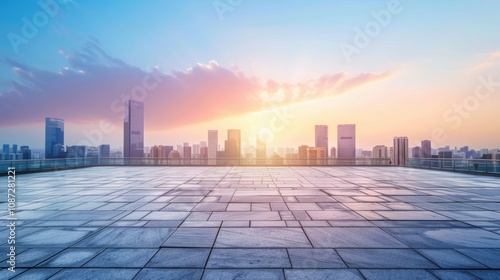 Empty square floor with city skyline background, Cityscape with urban regeneration, revitalized urban area showcasing renewal and growth