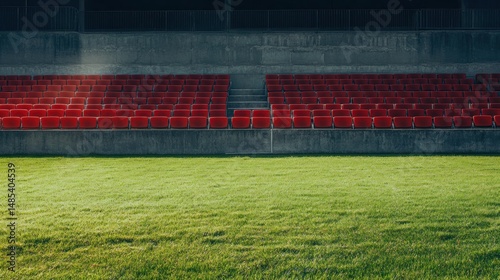 stadium, seat, grass, field, empty, red, concrete, arena, sport, game, spectator, bleacher, football, soccer, competition, athletic, event, match, sport, playing, pitch, green, daytime, photo, image, view, perspective, texture, colours, scene, background, structure, row, line, design, architecture, building, empty space, leisure