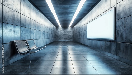 Empty Subway Corridor with Blank Billboard and Chairs