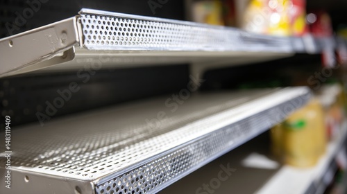 Empty supermarket shelves with bare metal rack, minimalist composition showing scarcity and lack of products. Concept of supply chain issues, retail challenges and economic crisis.