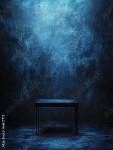table, spotlight, background, dark, blue, textured, studio, shot, product, placement, empty, surface, light, texture, colours, space, stage, scene, room, interior, design, presentation, display, platform, furniture, object, element, material, illumination, shadow, contrast, depth, mood, artistic, canvas, wall, floor, concrete, grunge, pattern, style, nobody, indoor, vertical, perspective, simplicity