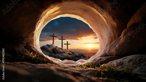 Empty tomb opening to three crosses on a hill with a radiant Easter sunset creating a powerful visual of resurrection, hope, and new beginnings