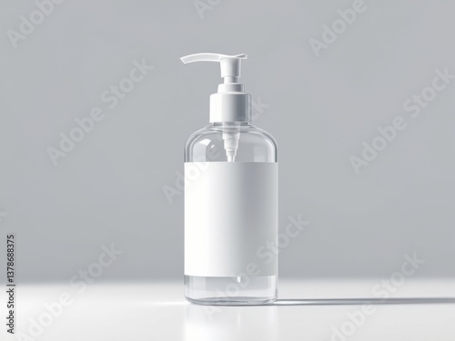 Empty transparent plastic bottle with white pump dispenser standing upright on white background.
