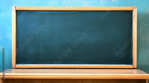 Empty Vintage Chalkboard on Wooden Desk, Blank Green Blackboard, Rustic Classroom Background