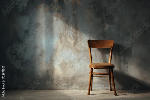 Empty vintage wooden chair against textured plaster wall with dramatic light and shadows