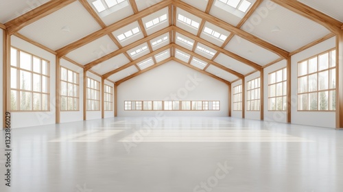 Empty warehouse interior with natural light. Modern industrial space with wooden beams and large windows. Concept of storage, factory, and architecture.
