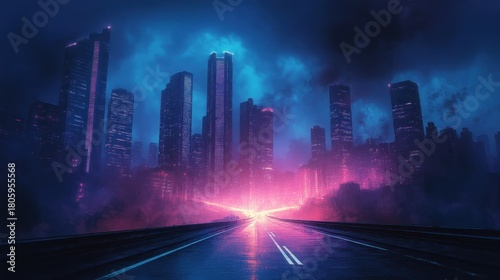 city, skyline, skyscraper, highway, road, neon, neon light, fog, mist, futuristic, night, teal, magenta, purple, blue, atmospheric, moody, dramatic, vanishing point, perspective, silhouette, metropolis, urban, tower, illuminated, glow, rainy, stormy, mysterious, surreal, digital, reflective, street light, foggy