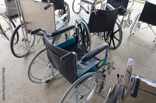 Empty wheelchair in hospital. Medical equipment in hospital for patient.