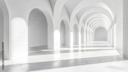 Empty white arched hallway, bright sunlight, architectural design, interior space, for use in presentations or posters
