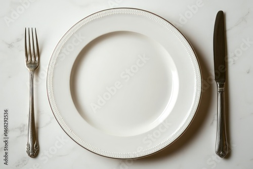 Empty white ceramic plate placed on a marble surface with a vintage silver fork on the left and a knife on the right, evoking anticipation and simplicity